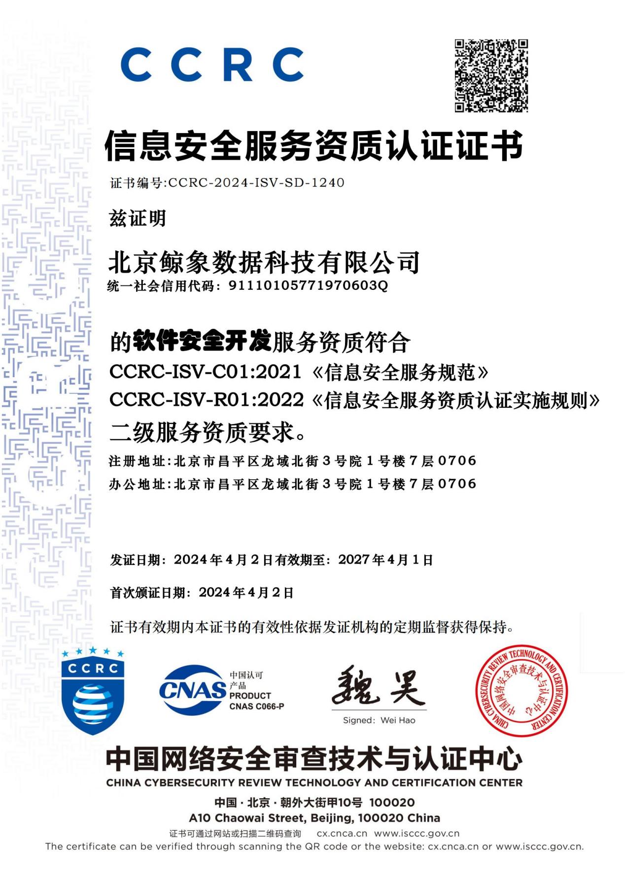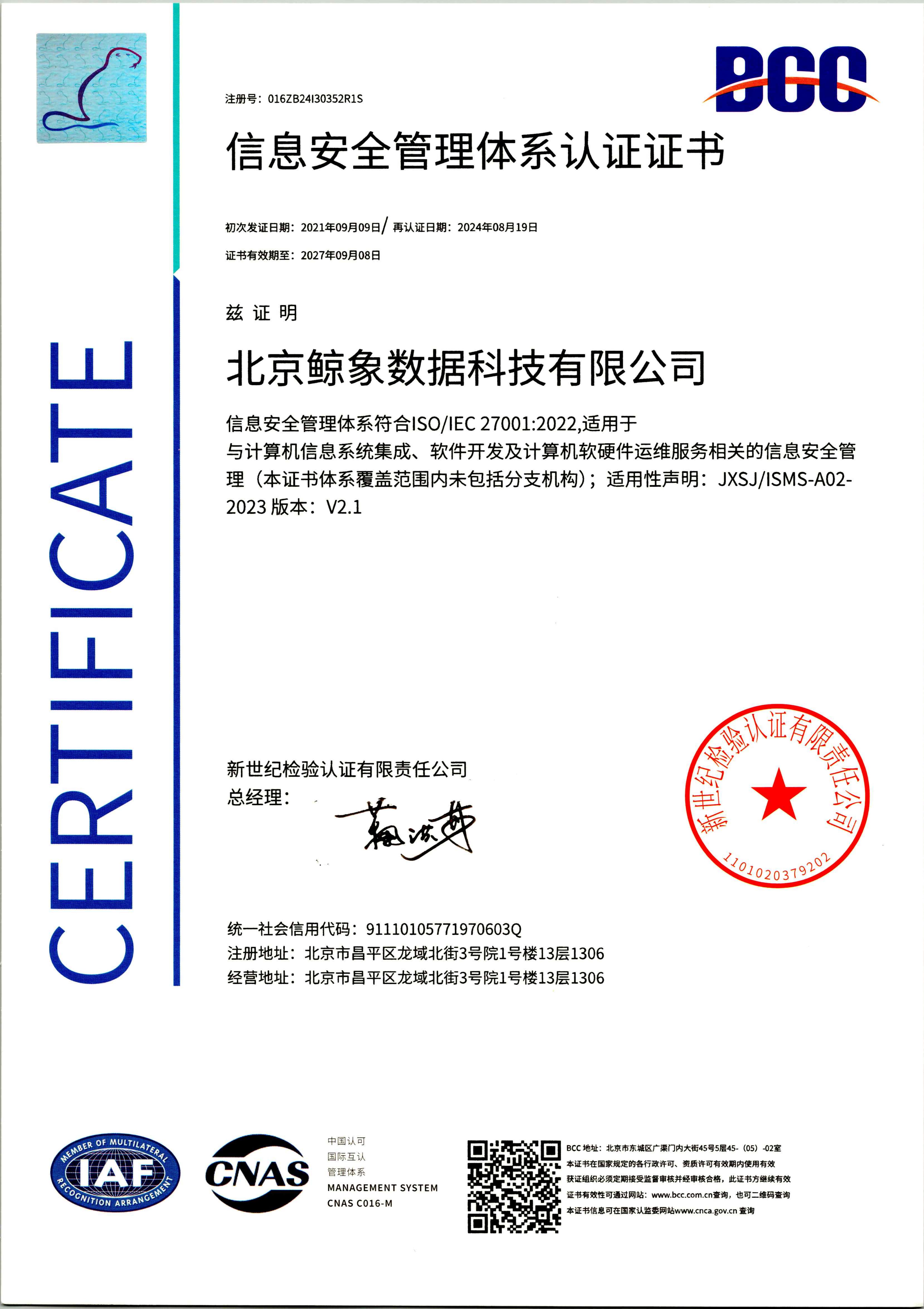 鯨象ISO27001信息安全管理體系認(rèn)證證書