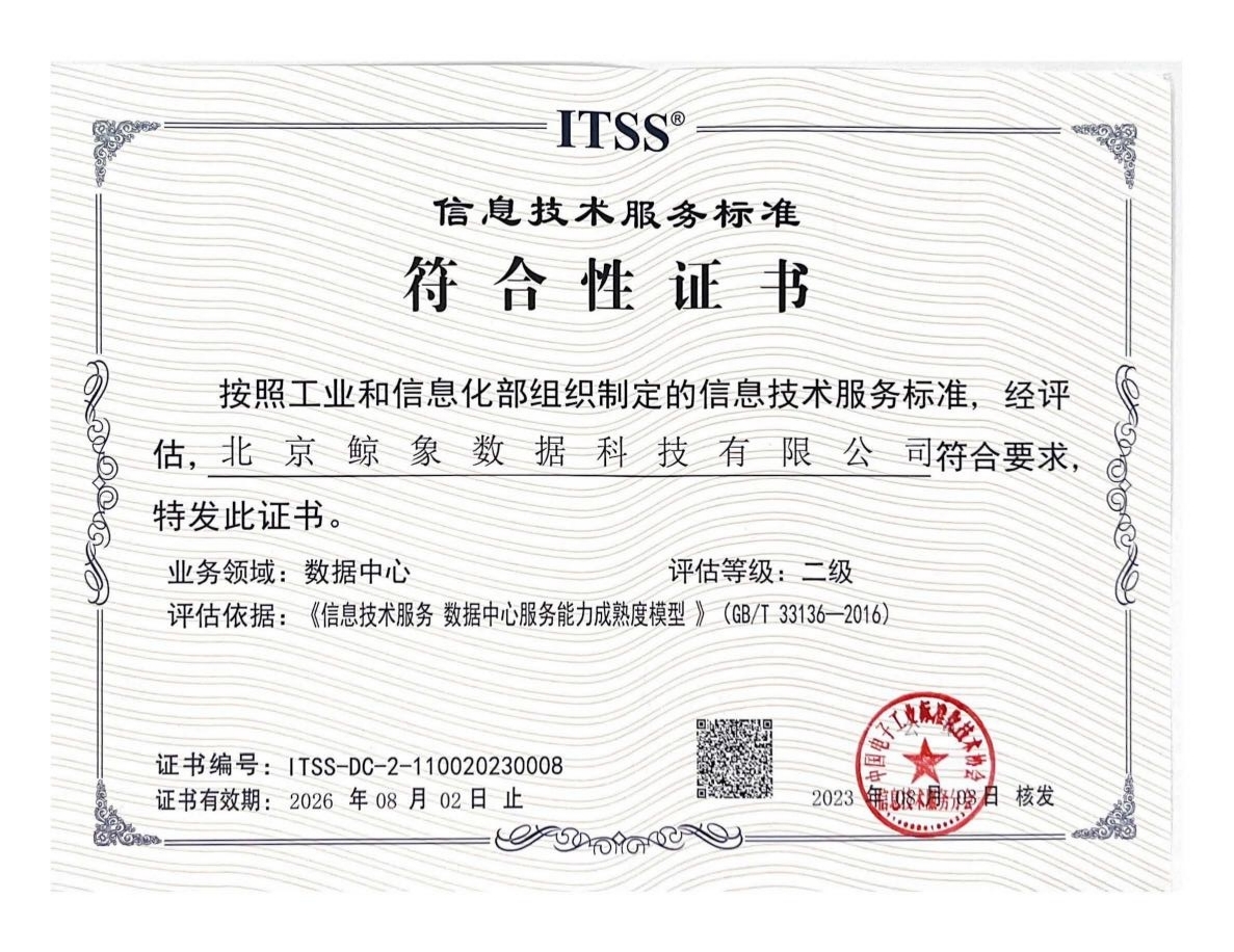 ITSS信息技術(shù)服務(wù)標(biāo)準(zhǔn)符合性證書(數(shù)據(jù)中心二級(jí))