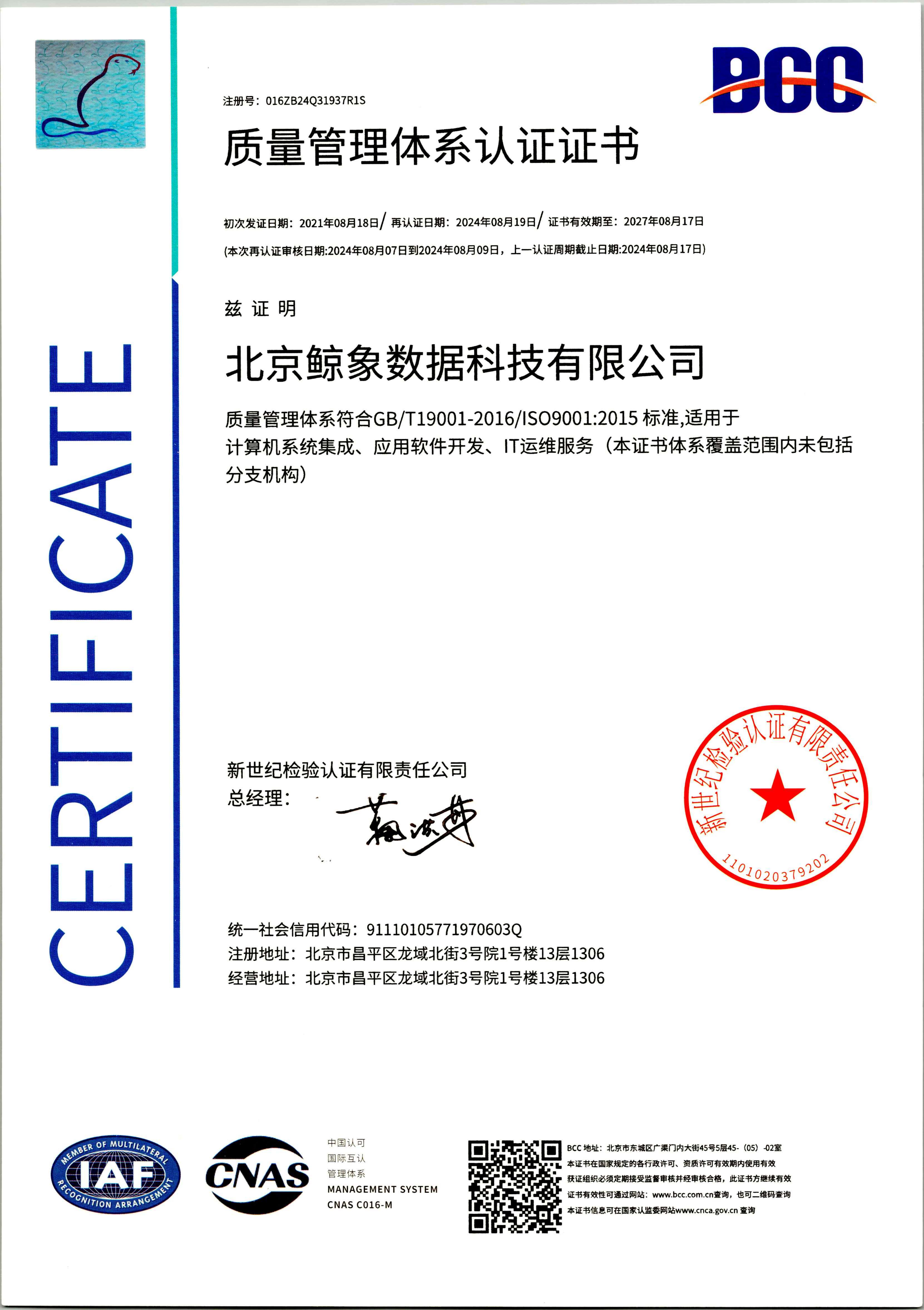 鯨象數(shù)據(jù)ISO9001質(zhì)量管理體系認(rèn)證證書